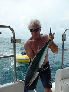 We've been trolling for two days and are beginning to wonder if the banana curse hit us? When all of the sudden: Zzzzzzzzzzzz!. Ahh the sweet sound of a fish taking off with the line. This is no small fish, it's a 6-7 kgs yellow fin tuna or big eye tuna and they know how to fight.
